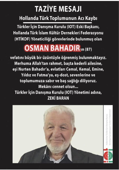 “Türkler İçin Danışma Kurulu (IOT) Eski Başkanı, Hollanda Türk İslam Kültür Dernekleri Federasyonu (HTİKDF) bünyesinde yöneticilik görevlerinde bulunmuş olan OSMAN BAHADIR’ın (87) vefatını büyük bir üzüntüyle öğrenmiş bulunmaktayız.