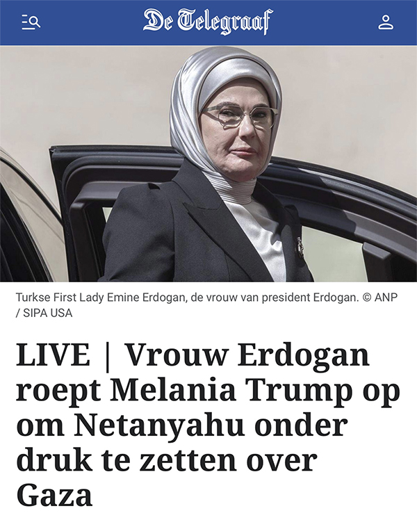Cumhurbaşkanı Erdoğan’ın eşi Emine Erdoğan’ın, Trump’ın eşi Melania Trump’a gönderdiği mektuptaki “Ukraynalı çocuk için gösterdiğiniz hassasiyeti Gazze için de göstereceğinize inanıyorum” sözleri, Hollanda basınında geniş yer buldu.